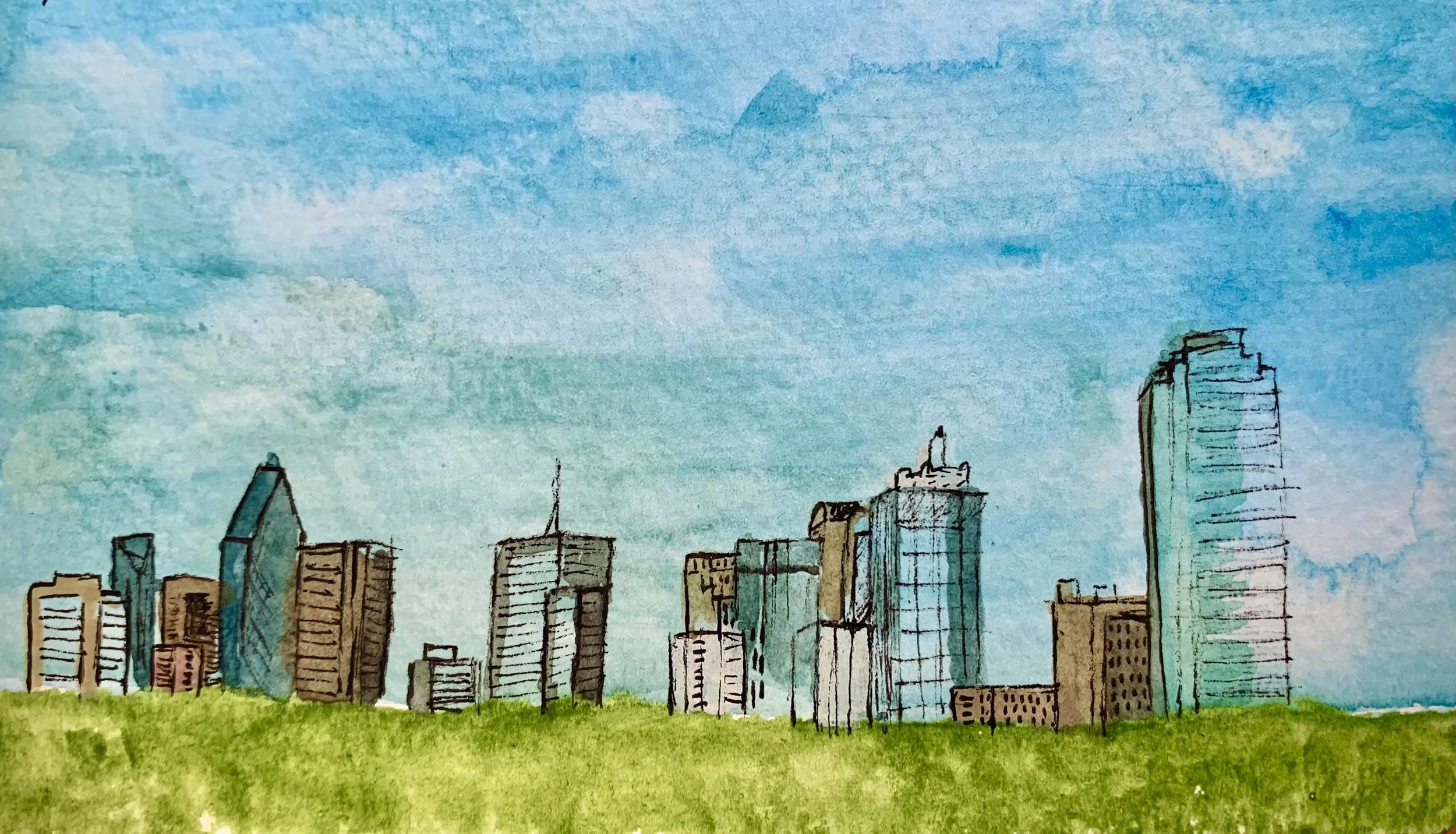"Dallas, Tx", watercolor and pen on paper, 5w x 3h. 2020